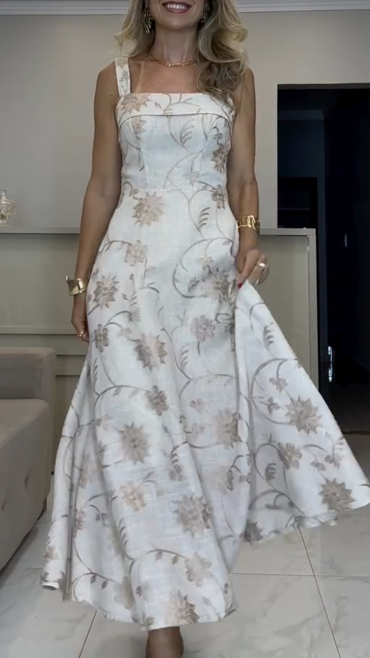 2. Design Details: This is a sleeveless halter-neck maxi dress with a square neckline and wide shoulder straps. The sleeveless design reveals the neck and shoulders. The entire dress is covered with light gold/beige floral jacquard, giving it a vintage and sophisticated look. The waist is cinched before merging into a wide A-line skirt with natural pleats. The square neckline and shoulder straps are decorated with visible stitching to enhance the silhouette.